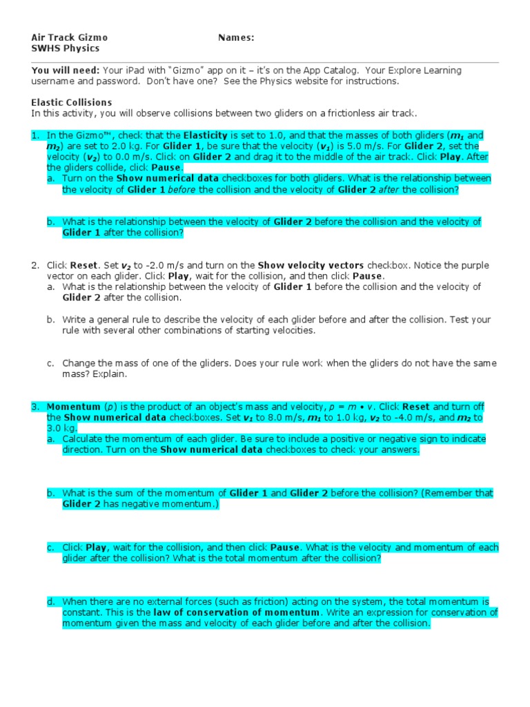 Airtrack Answers En5kg9wpgkno from idoc.pub Kinetic energy depends on both the mass and velocity of the object: And use the gizmo to check your answer. Kinetic energy depends on both the mass and velocity of the object: In order to economize on both computer time and computer memory, matlab uses. Click play and then pause after the collision. Check that the elasticity is set to 1.0. Turn off show numerical data for both gliders. Check that the elasticity is set to 1.0.